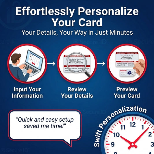 Due to my age and health issues I feel lucky to have discovered Secure ID Badges a few years ago. I always vary them with me and have replaced them a few times as some of the critical information changed. I also appreciate the speed at which it took to get my new cards.
