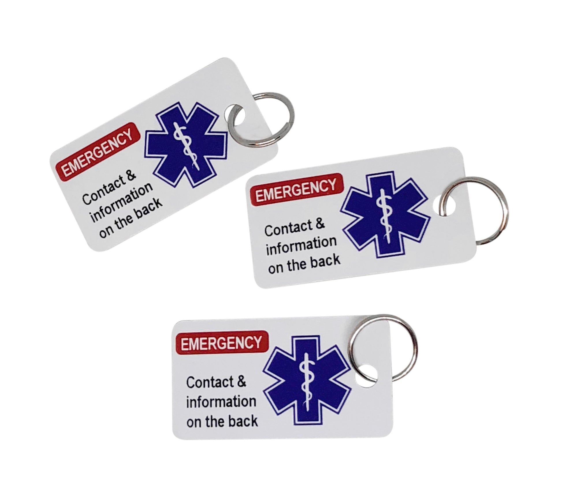This could be the most important key-tag you carry! Having an Emergency Contact Card with you can greatly speed up notifying your loved ones in an emergency, and for First Responders to quickly have. This key-tag conveniently fits on your key ring, purse, or bag and is customized with your information including name, address, emergency contacts, and a short notes field which could include another contact, allergies, etc. This product includes 3 key-tag ICE cards and comes with 3 split rings for easy addition. Note this card is made of high-quality composite PVC material.