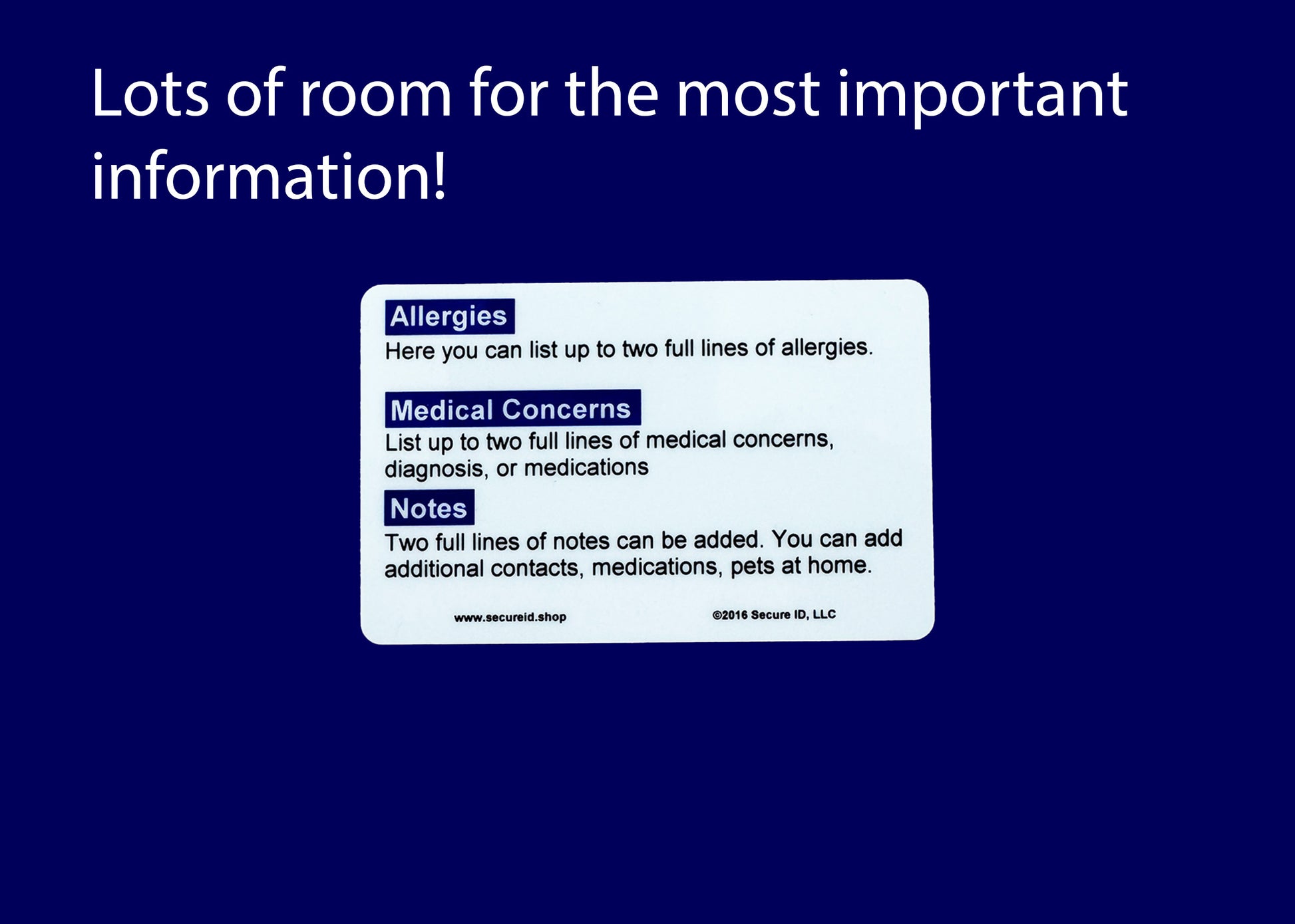 • Includes space for allergies, medications, and medical conditions