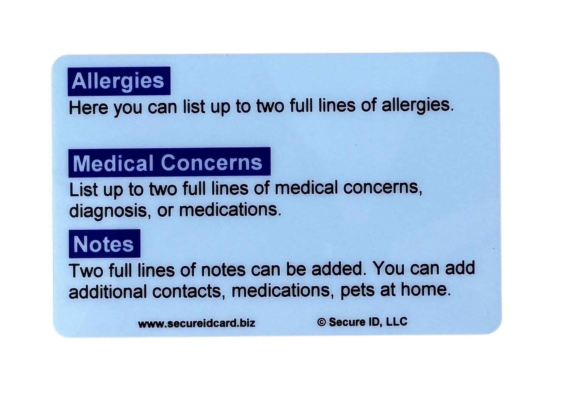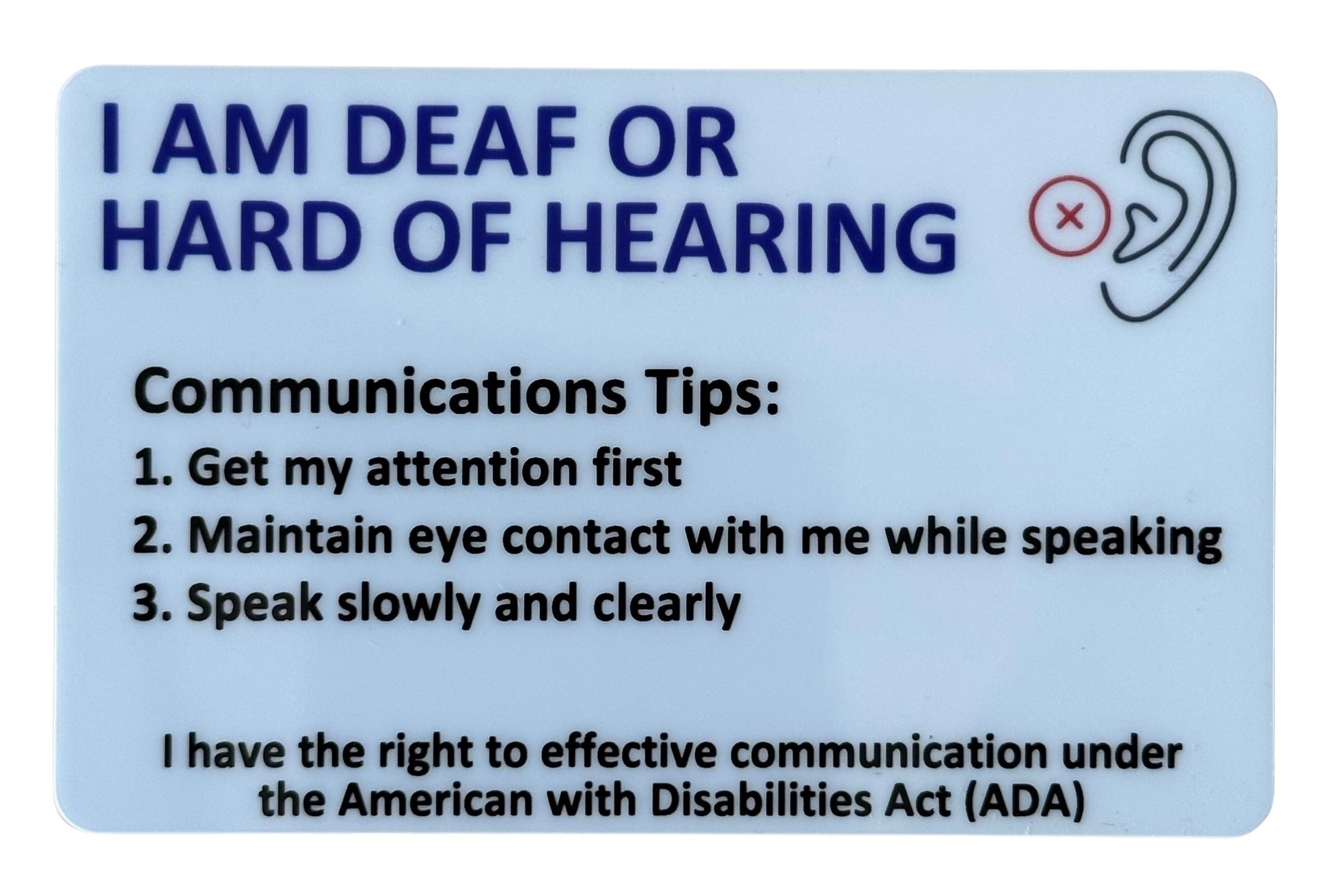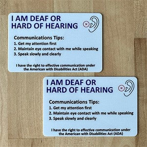 Secure ID's custom Hard of Hearing Awareness cards can easily communicate to others that you are deaf or hard of hearing. We use the same equipment and materials that are used for making employee badges and driver's licenses so the cards fit in a wallet or purse slot. They are durable and waterproof. The back of the card is customized with your name, emergency contacts and up to 3 lines of any notes you want to communicate.