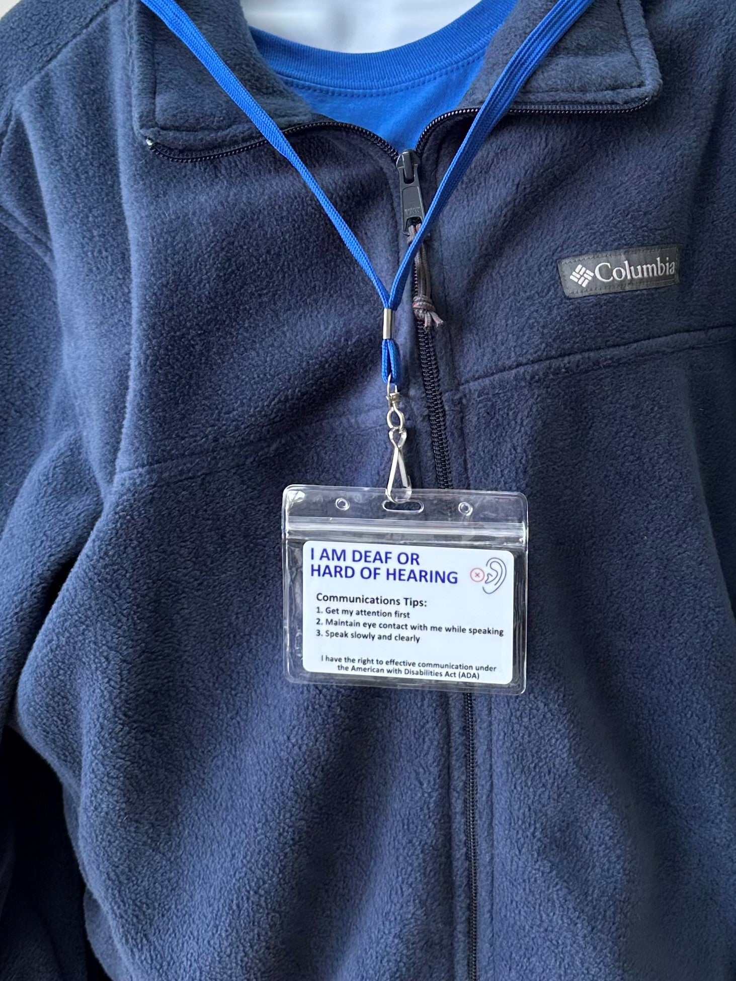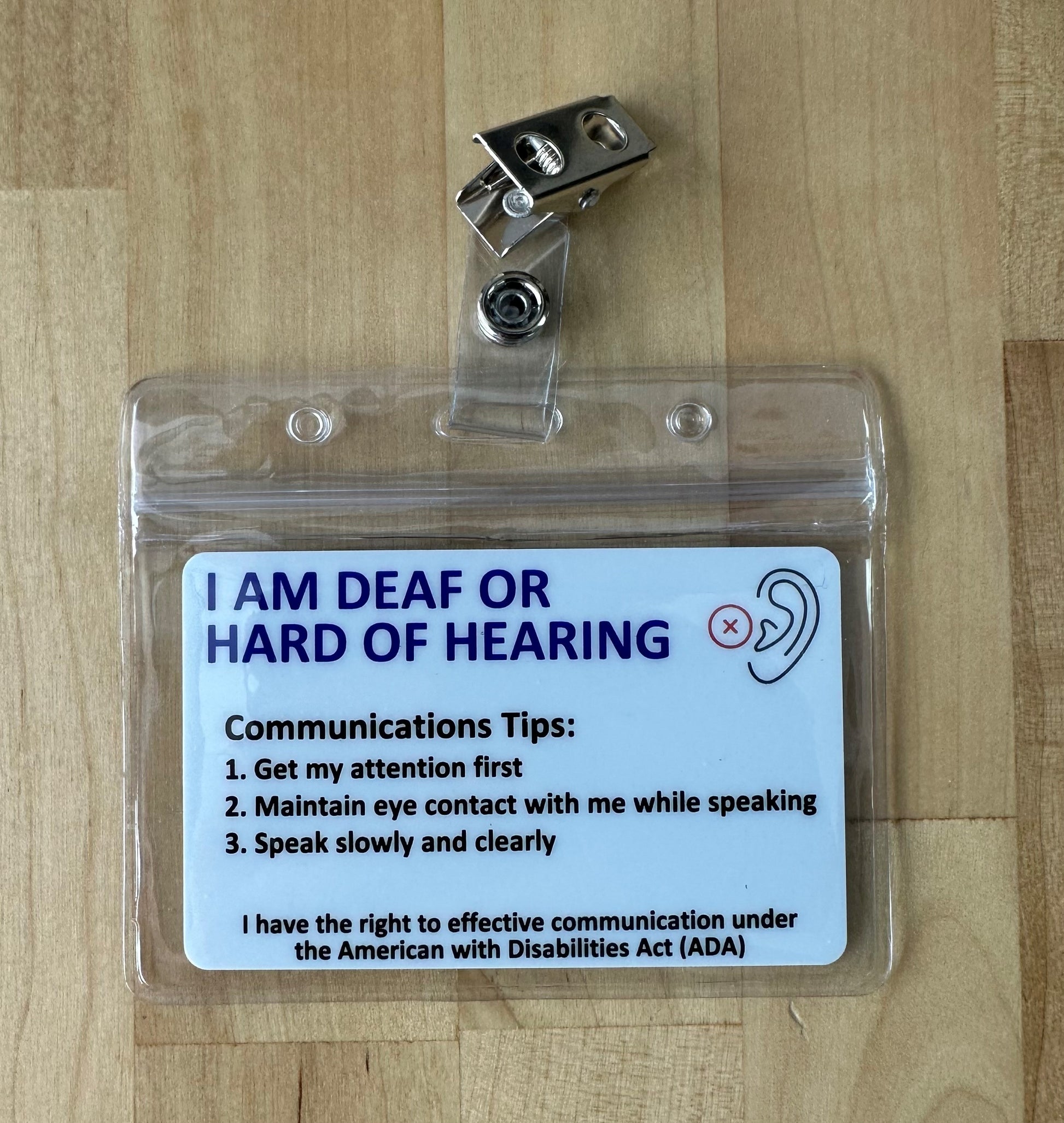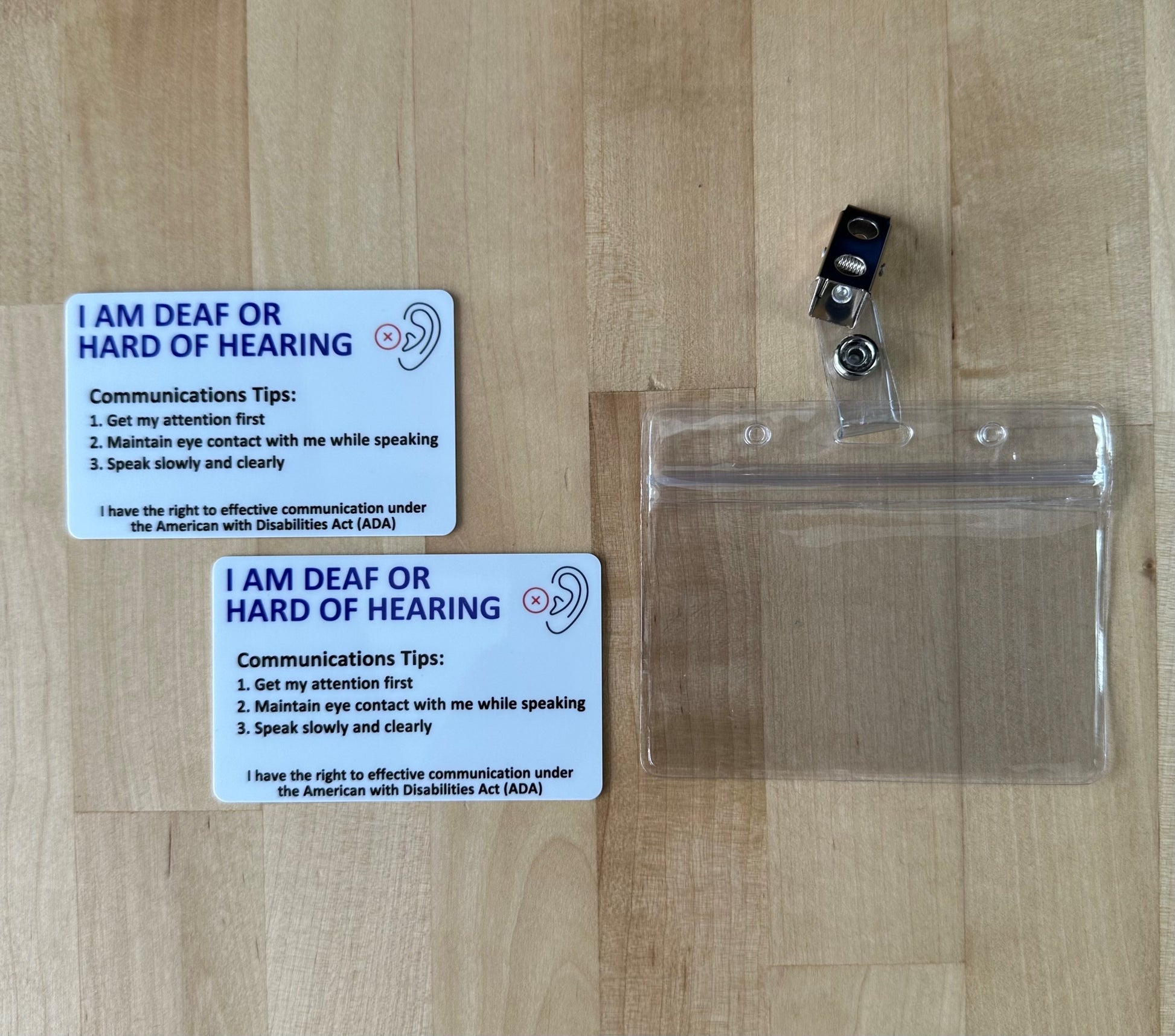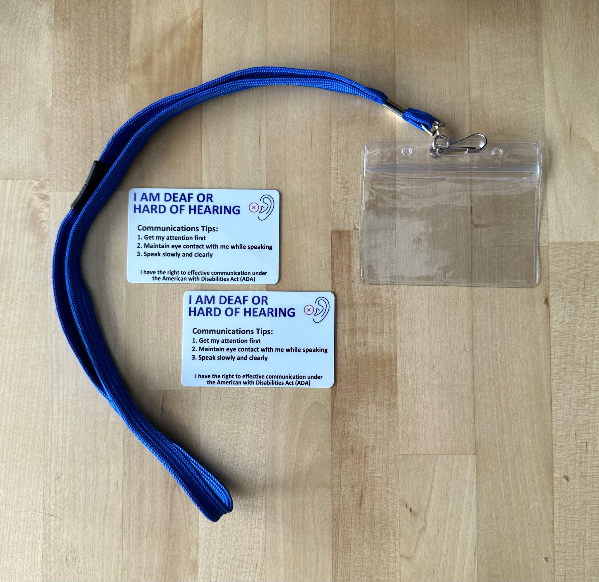 Every order comes with an included key tag that can be attached to keys or a zipper so you always have a quick, easy way to communicate your hearing loss to others! We offer several combinations of cards, badge holder with a clip for clothing or a safety lanyard with badge holder to wear your ID around your neck. Please enter your information EXACTLY as you want it printed on your card.