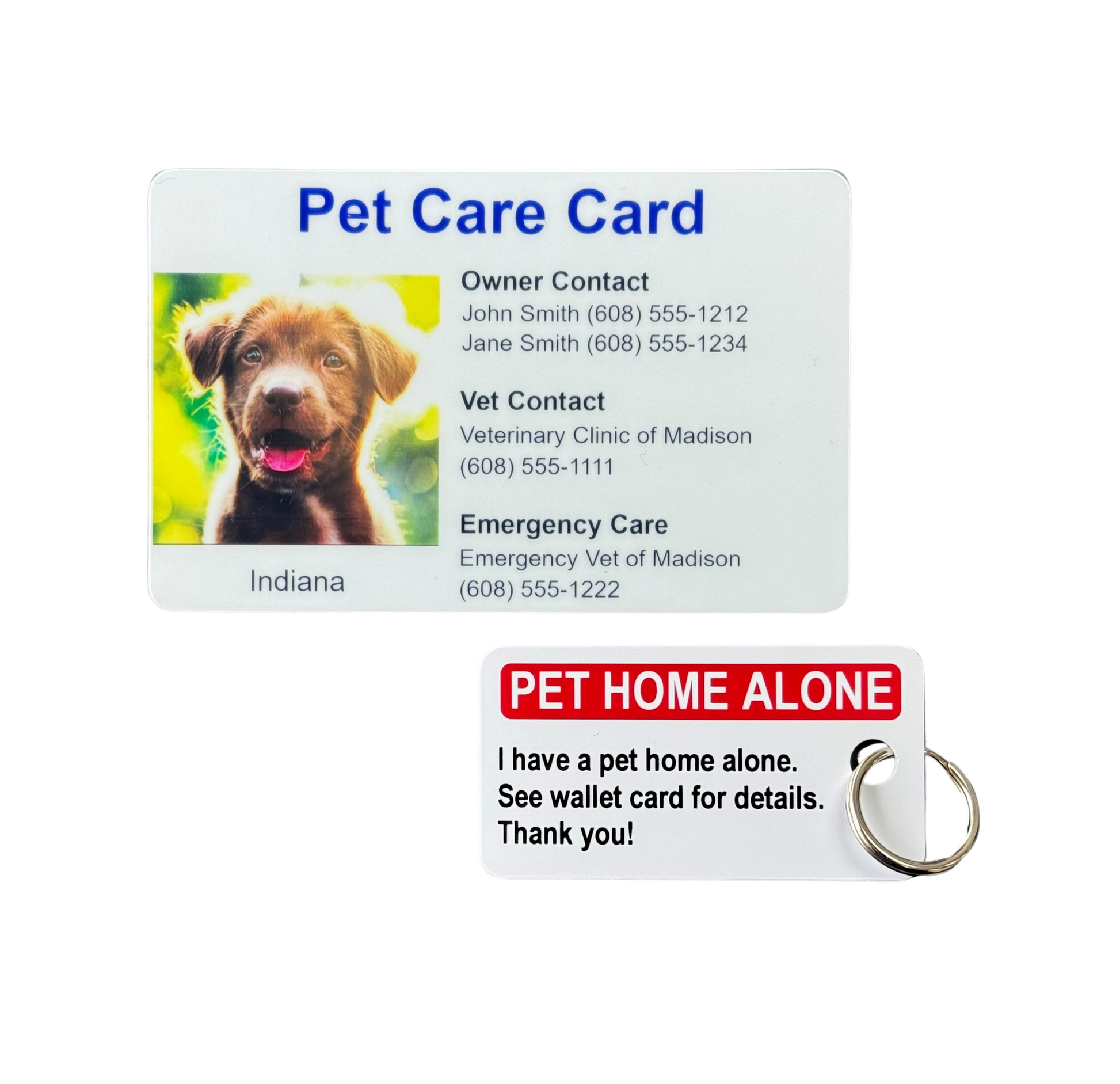 Your pets may be furry but they are family. See how your card will look using our customization template. Can be used as proof of ownership if your pet goes missing. The wallet card is a 30 mil PVC card that is waterproof and durable and includes a key tag letting people know your pets are home alone in an emergency. They are the same size as a credit card. Our cards are printed using the same equipment we make employee ID cards on.