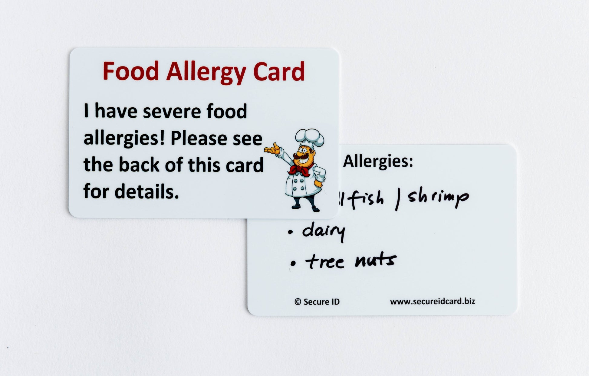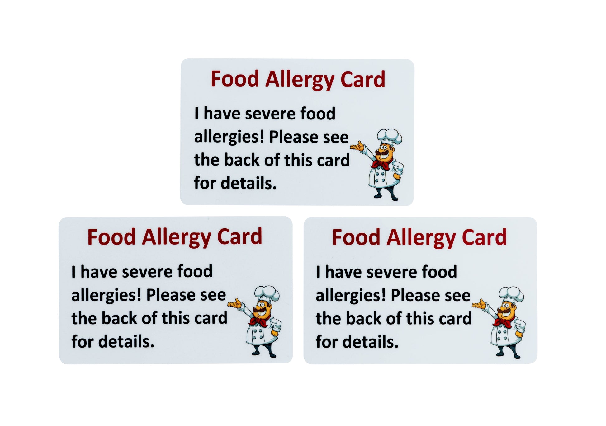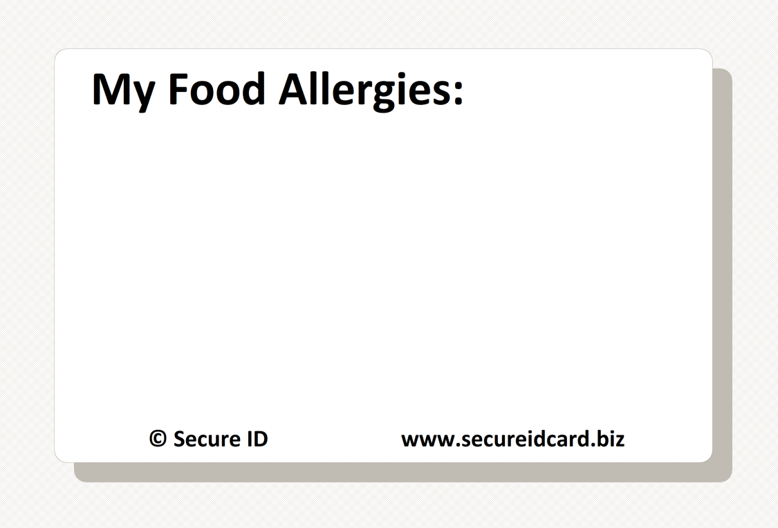 Do you and your loved ones suffer from food allergies? Whether your reaction is mild or severe, this safety card can alert anyone preparing your food on what to avoid to help keep you safe and prevent an allergic reaction from taking place in the first place.